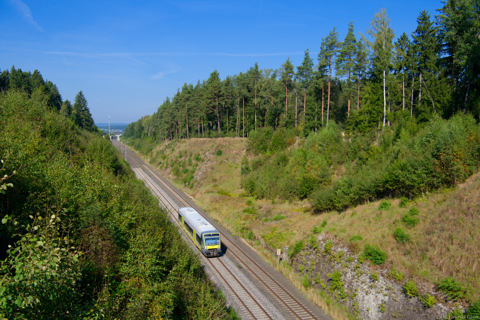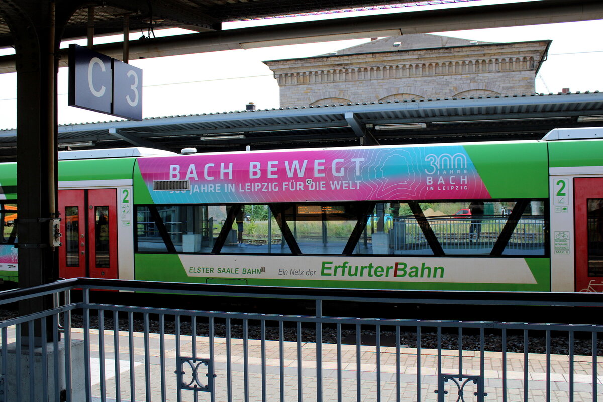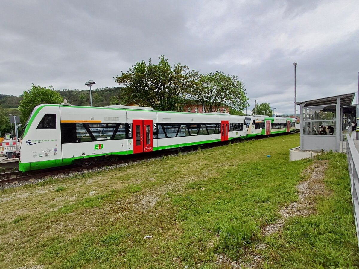 Bahnhofsschild mit Triebwagenfront des VT 745 der VIAS am Abend des 6.6.2019