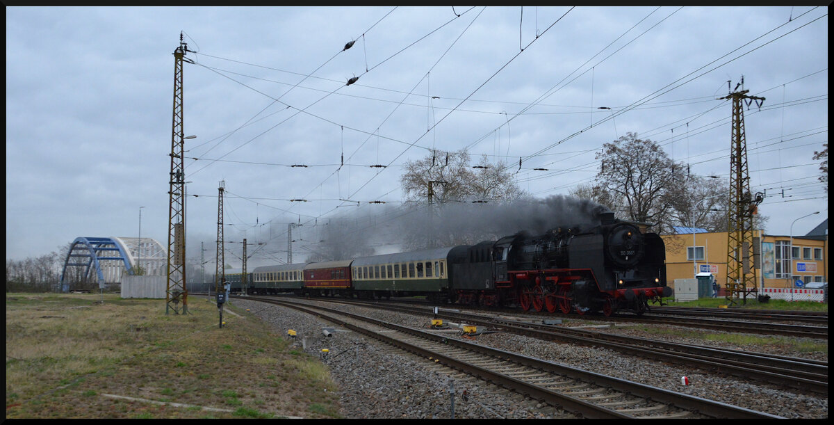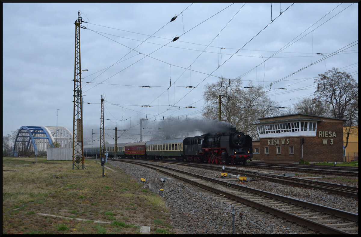 Die Dampflok 50 3501 (MDV) mit dem Sonderzug DZ 93507 Dresden Hbf - Meiningen am 12.04.2026 auf der Rückfahrt vom 18. Dresdner Dampfloktreffen bei der Durchfahrt in Riesa.