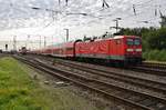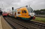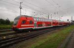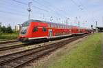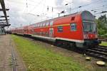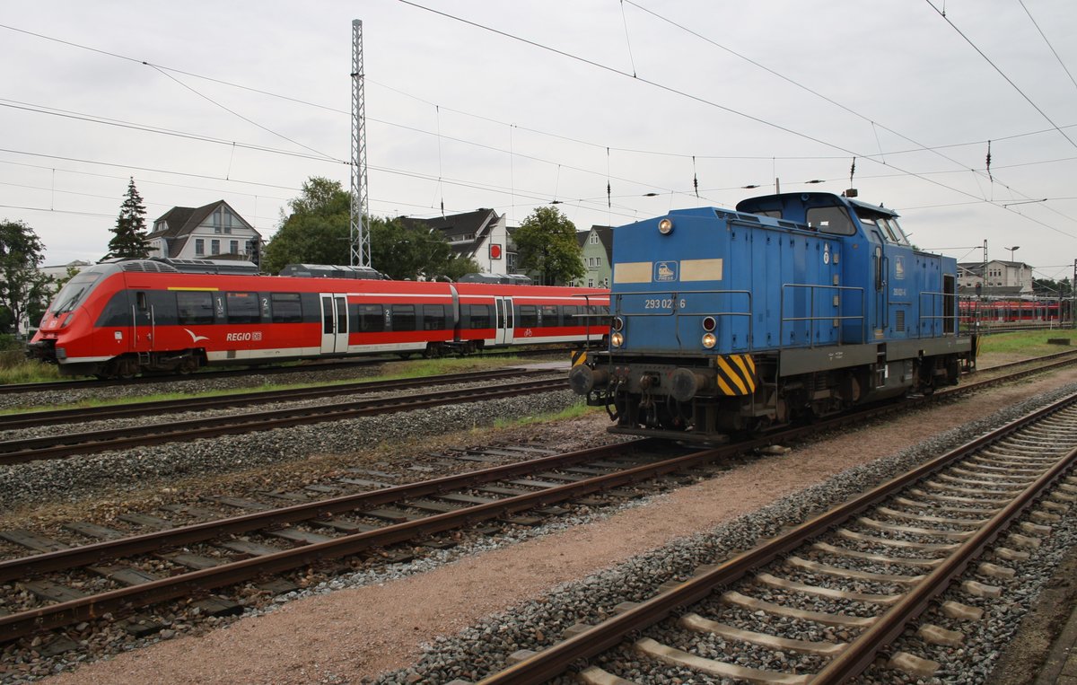 442 338-0 und 442 856-1 treffen am 12.8.2017 als S1 nach Warnemünde im Rostocker Hauptbahnhof auf 293 021-6.