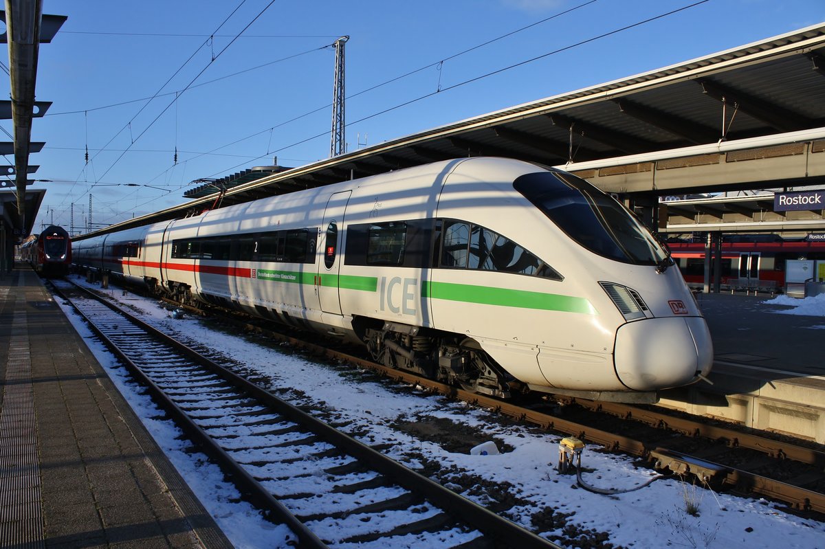 411 559-8 "Passau" verlässt am 31.01.2021 als ICE1672 von Frankfurt(Main) Hauptbahnhof nach Stralsund Hauptbahnhof den Rostocker Hauptbahnhof.