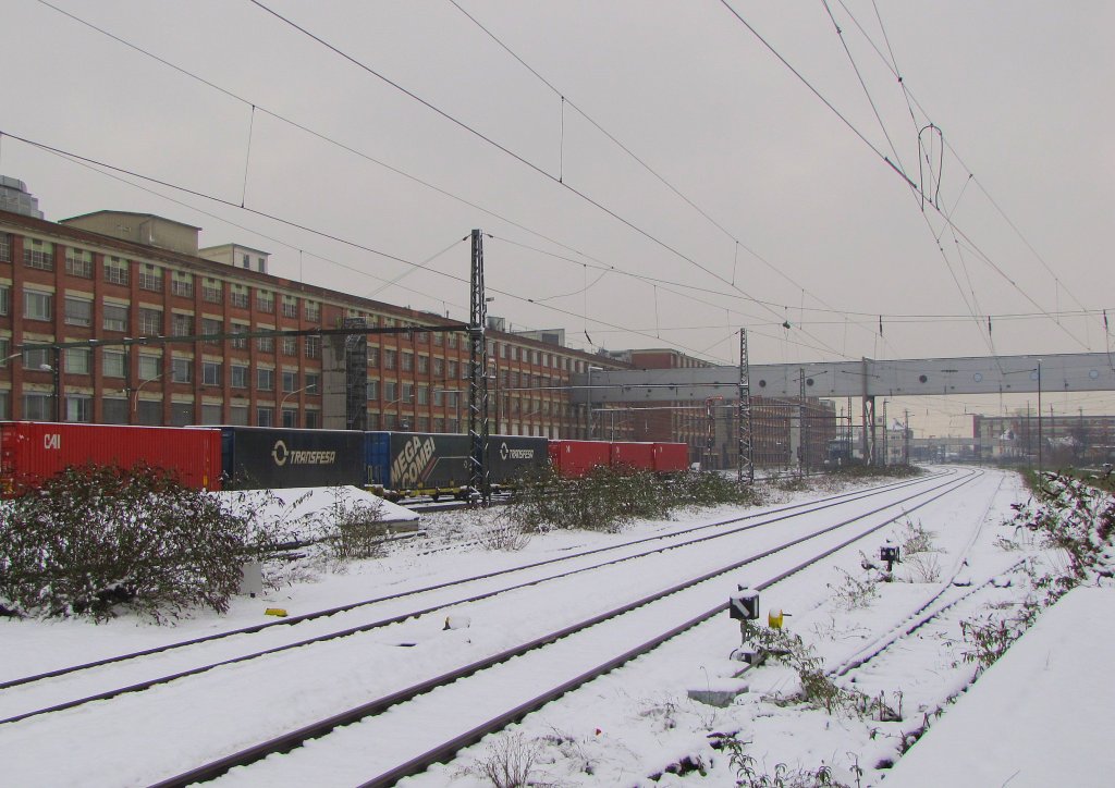 Die verschneiten Gleisanlagen in Rüsselsheim Opelwerke; 20.12.2011
