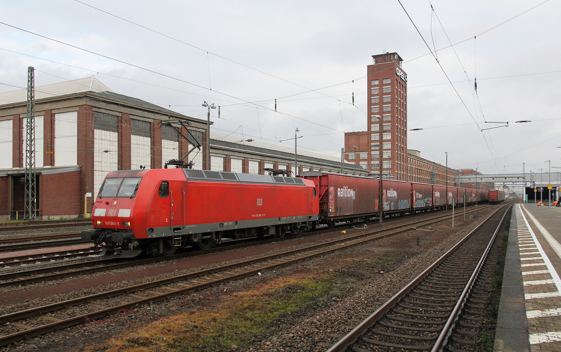 DB Cargo 145 064 verlässt mit einem Autologistik-Zug den Güterbahnhof Rüsselsheim Opelwerke. Aufnahmedatum: 30. November 2017