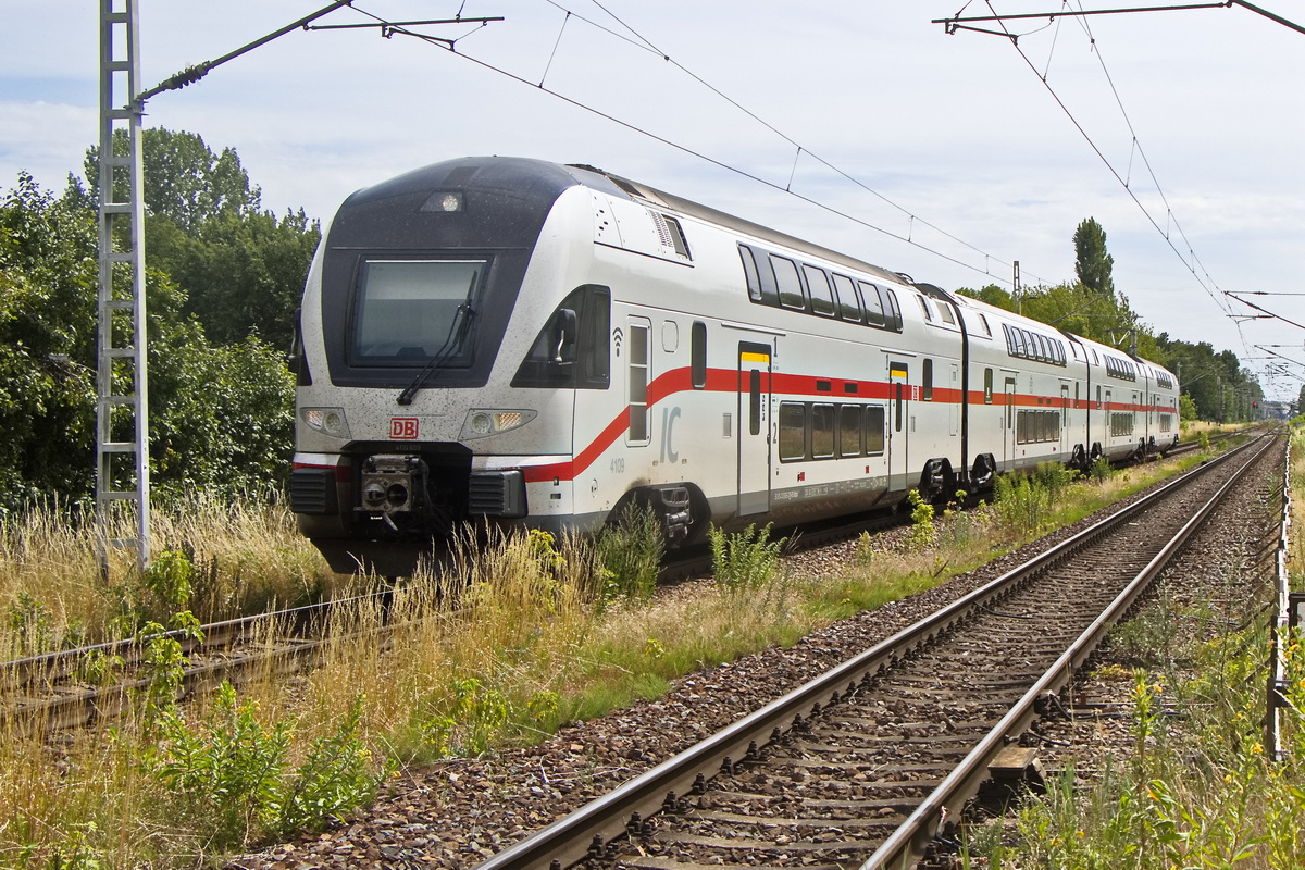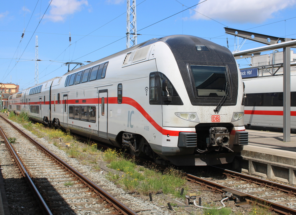 IC 2 Kiss 4110 117/617 mit dem Taufnahmen "Mecklenburgische Ostseeküste" ist auf dem IC 2273 von Rostock Hbf (WR) nach Chemnitz Hbf (DC) über Berlin (BL) pünktlich unterwegs, hält grade in Schwerin Hbf (WS) abweichend auf Gleis 3 am 01.02.2025