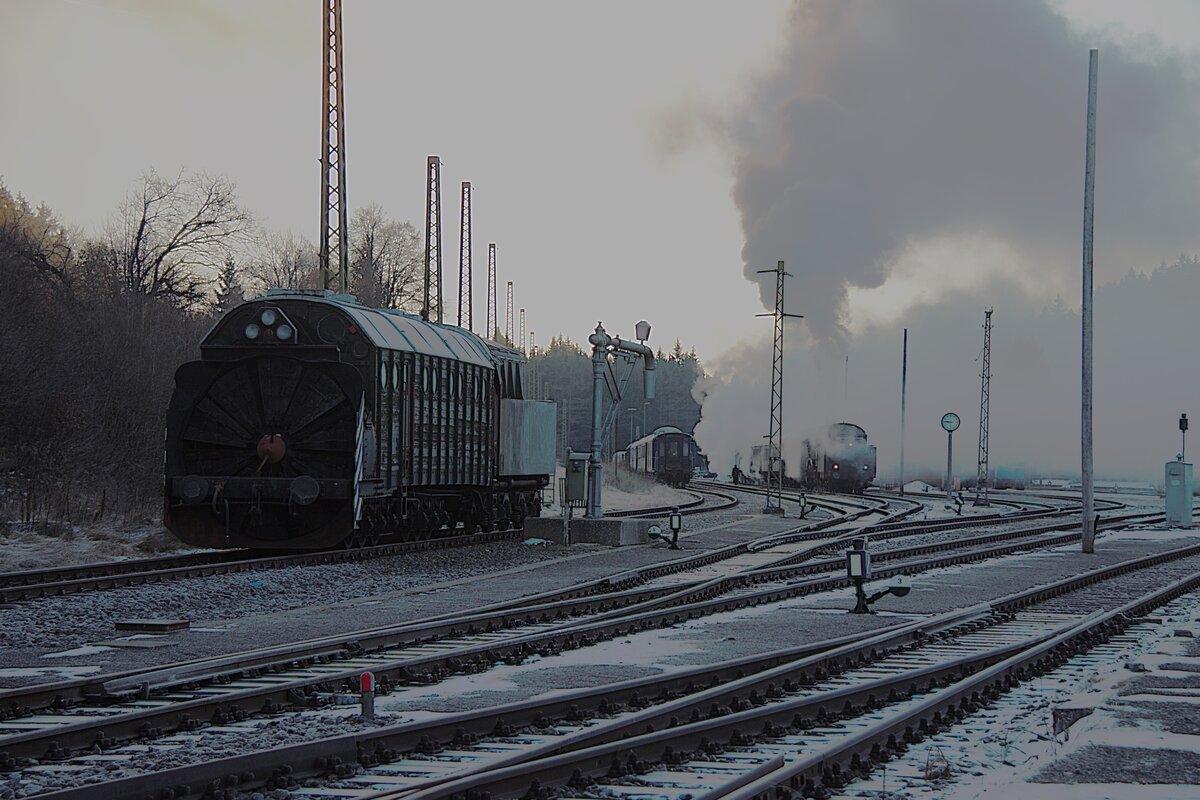 Ein nebliger, eiskalter Morgen mit wenig Schnee, am 29.12.2025 wird im Museumsbahnhof Seebrugg für eine Winterdampffahrt ein Zug mit der 58311 vorbereitet. Eine Dampfschneeschleuder ex ÖBB steht kalt daneben. Arthur Beusch