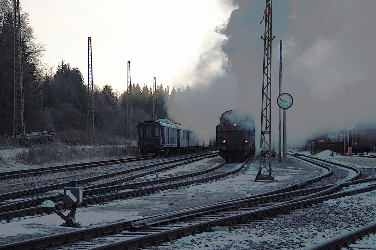 Ein nebliger, eiskalter Morgen mit wenig Schnee, am 29.12.2025 wird im Museumsbahnhof Seebrugg für Winterdampffahrten ein Zug mit der 58311 vorbereitet. Arthur Beusch