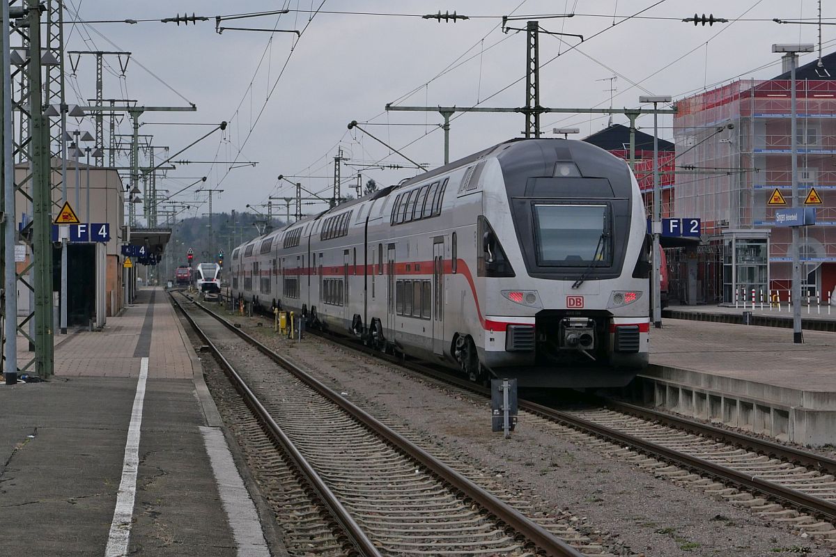 Da das Gleis noch von einem RABe 506 nach Schaffhausen belegt ist, muss der zur Bereitstellung eingefahrene 4010 606-0 noch einen kurzen Augenblick warten, um bis zur endgültigen Halteposition vorfahren zu können (Singen (Hohentwiel), 28.01.2023)