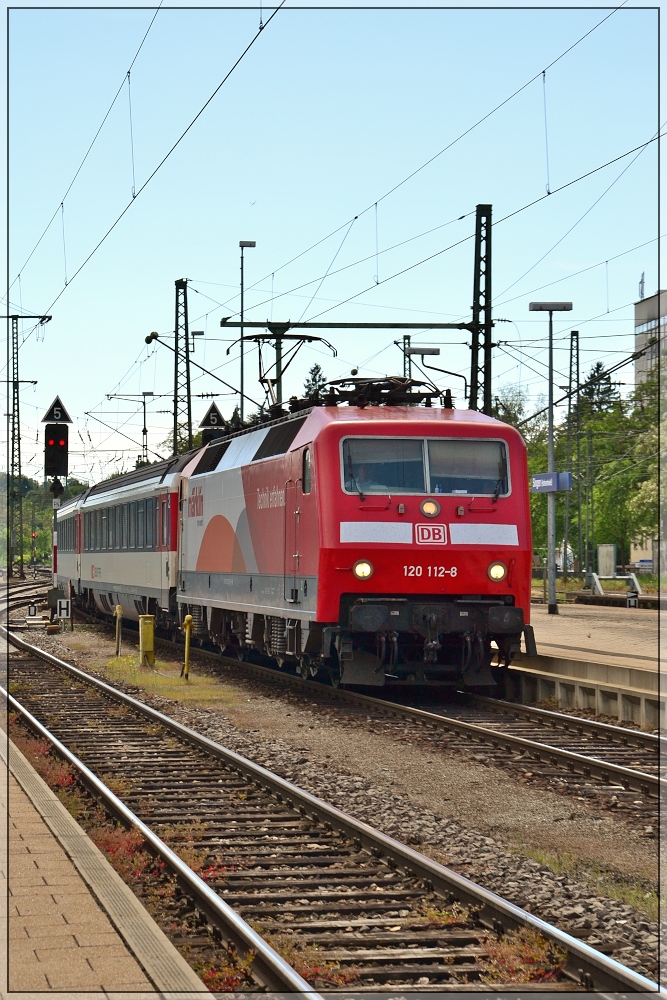 Märklin-Eisenbahn bei der Einfahrt nach Singen. IC Stuttgart-Zürich mit 120 112-8. ( Mai 2012)
