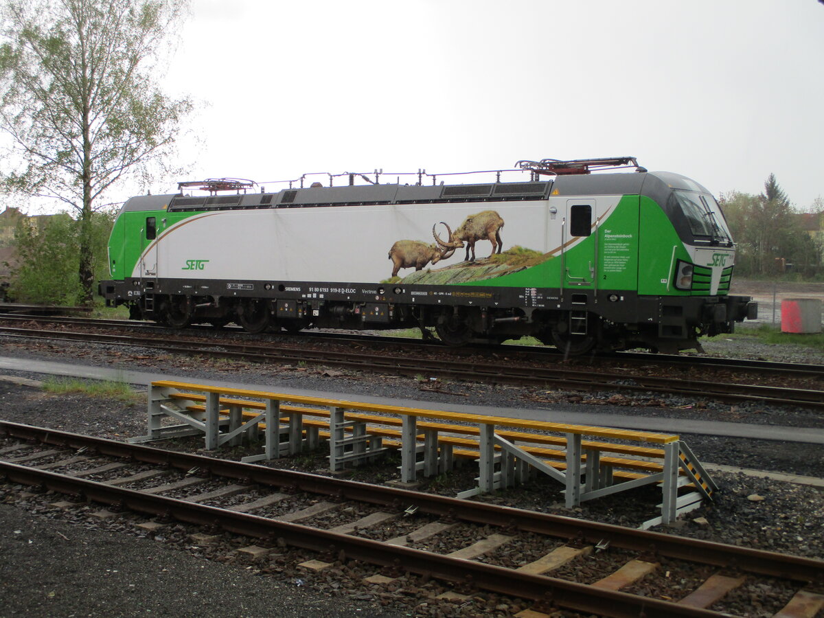 Sonneberg lohnte sich,am 17.April 2024,als dort auf der dortigen Ladestraße die ELOC 193 919 stand.Aufgenommen vom Bahnsteig.