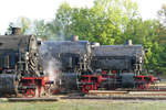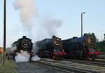 Zur blauen Stunde präsentieren sich 95 009 und 86 457 am 18. Oktober 2025 im Bahnbetriebswerk Sonneberg.
