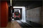 Während der Talent 2 den Stuttgarter Hauptbahnhof verlässt, fährt der S-Bahnzug der Baureihe 430 hinunter in seine Tunnelstation. Links schlängelt sich noch ein geschobener IC-Zug aus dem Bahnhof.