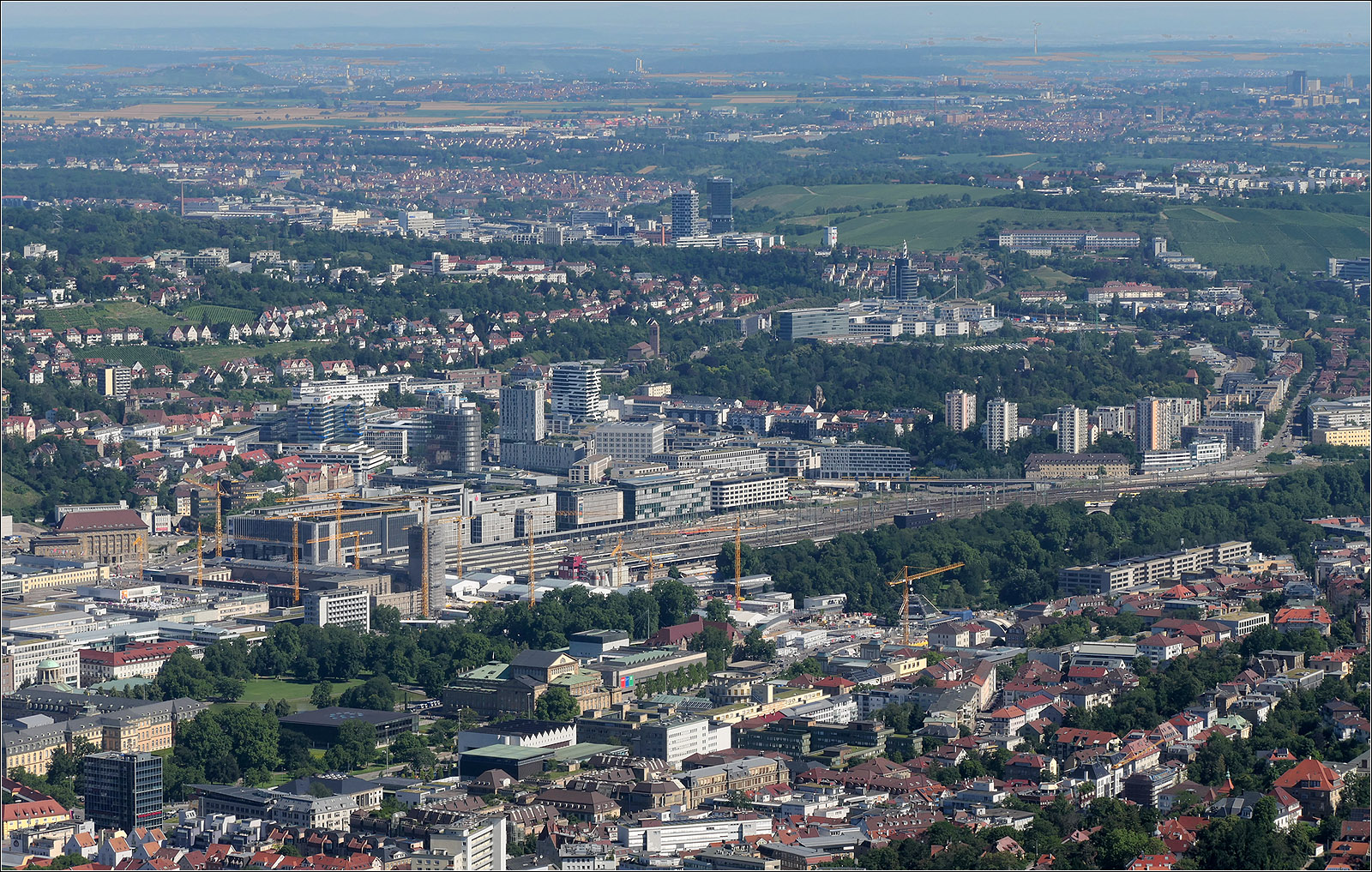 Das ehemalige Güterbahnhofgelände wurde zu großen Teilen in den letzten Jahrzehnten durch eine dichte und teilweise hohe Bebauung überbaut. Weiter oben auf der linken Seite der Killesberg und fast am oberen Bildrand ist der Hohenasperg zu sehen. Rechts ganz oben erkennbar am schwarzen Wüstenrot-Hochhaus liegt Ludwigsburg.