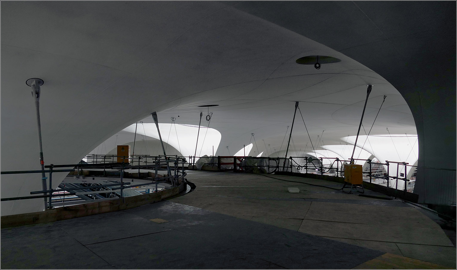 Blick auf eine zukünftigen Treppenabgang von der mittleren Zwischenebene zum Bahnsteig der Gleise 5 und 6. Beim Blick auf die geschlossen Rückseiten der Kelchstützen wirkt die halle dunkler und der unterirdische Charakter der Bahnsteighalle wird stärker betont.