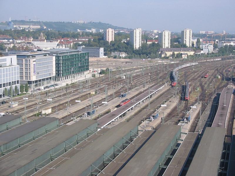 Stuttgart Hbf am 24.09.2005. Ausblick von der Aussichtsplattform des Turms am Empfangsgebäude. Wenn die Pläne zum Umbau des Bahnhofs Wirklichkeit werden, würden alle Bahnanlagen, die hier zu sehen sind, verschwinden. Stattdessen würde es einen unterirdischen Durchgangs-Bahnhof mit acht Gleisen geben, der zudem quer zur bisherigen Gleisführung liegen würde. Übrig bleiben würde nur das alte Empfangsgebäude, während die dann geräumten Flächen für die weitere Stadtentwicklung herangezogen werden sollen.