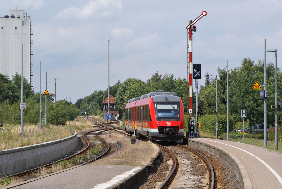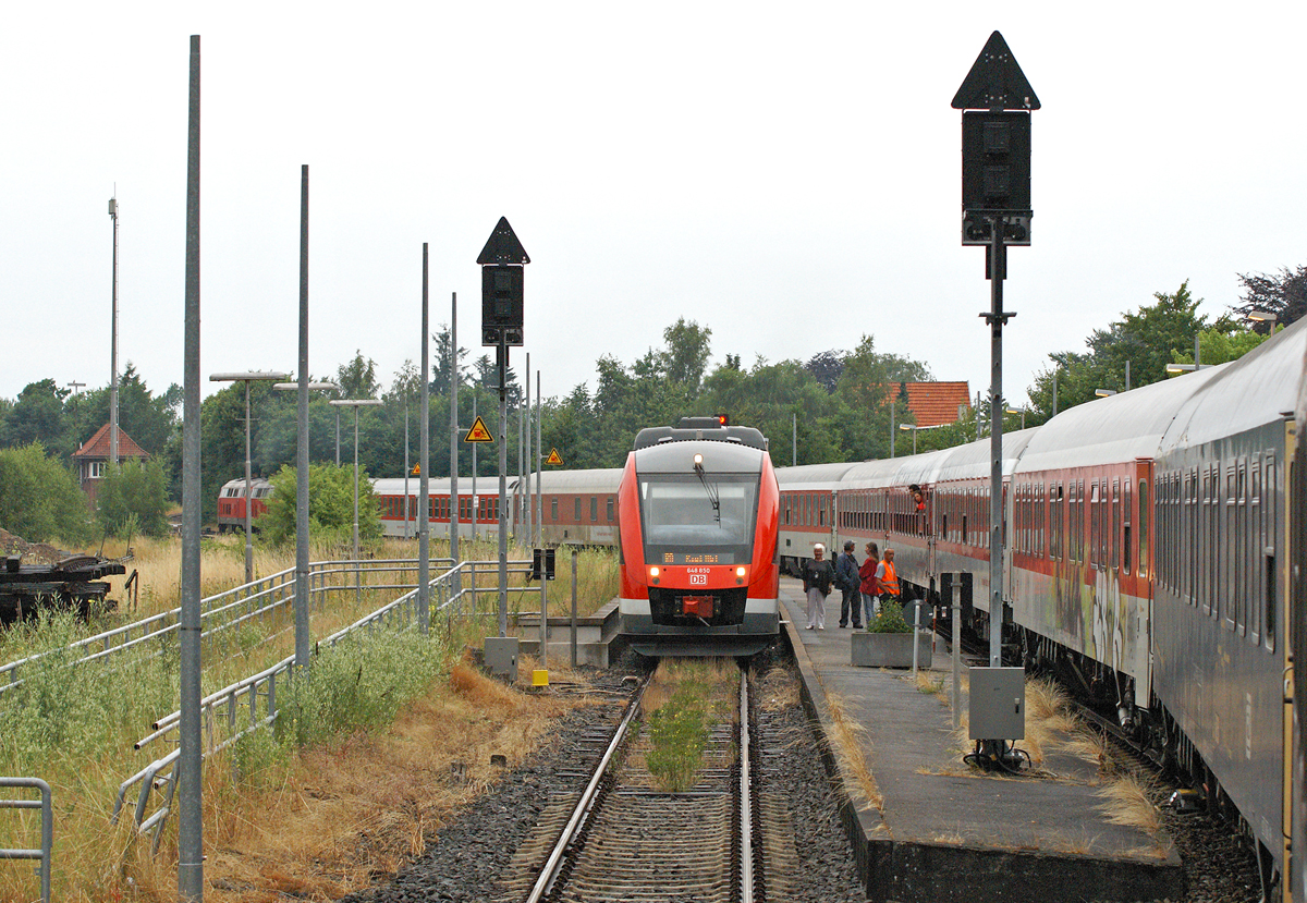 Lok 2 der Angelner Dampfeisenbahn (Verein: Freunde des Schienenverkehrs Flensburg e.V )fährt mit einem Zug in den Bahnhof Süderbrarup ein. Die bereits umgelaufene Dampflok F 654 (Frichs 1949/358) wird den Zug Richtung Kappeln ziehen.