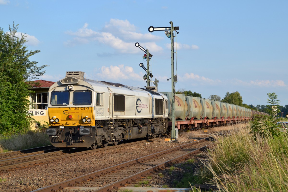 247 052-4 steht am Abend des 15.07.2014 mit französischen Tapps in Tüßling und wartet die Kreuzung mit 2 RegionalBahnen ab.