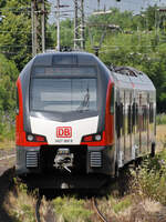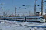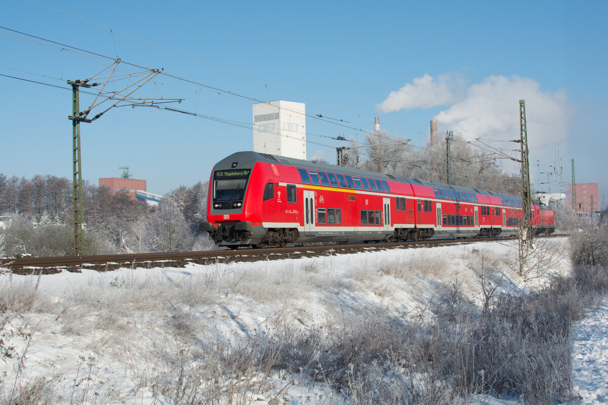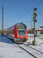 RE2 nach Düsseldorf Hbf ist hier bei der Ausfahrt am Hauptbahnhof Wanne-Eickel zu sehen. (Februar 2021)