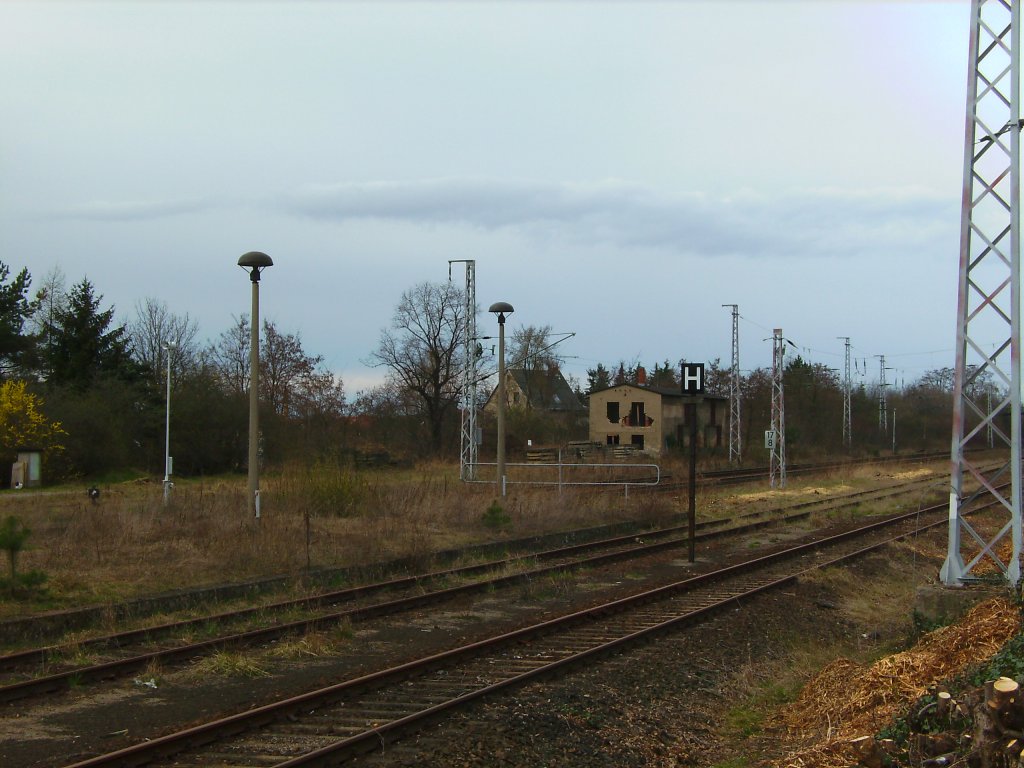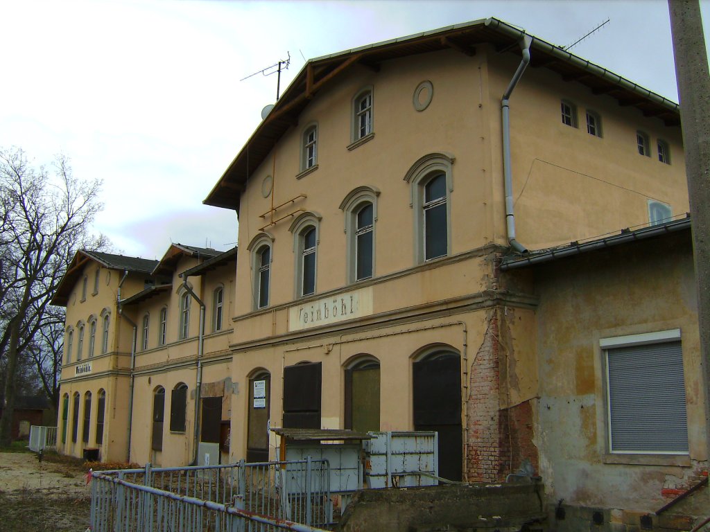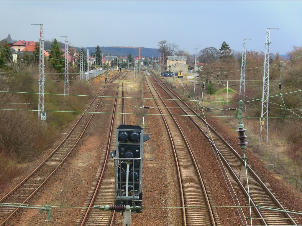 Blick auf das EG des Bf Weinböhla von der Berliner Straße aus auf den Inselbahnsteig mit Signalbrücke.Man beachte die richtig gehende Uhr im derzeit stillgelegten Bahnhof.