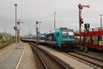Im Licht der Abendsonne am 22.04.2025 zeigt sich die 246 010-3 vor einer Doppelstockgarnitur im Bahnhof Westerland (Sylt)