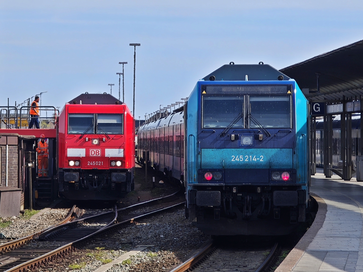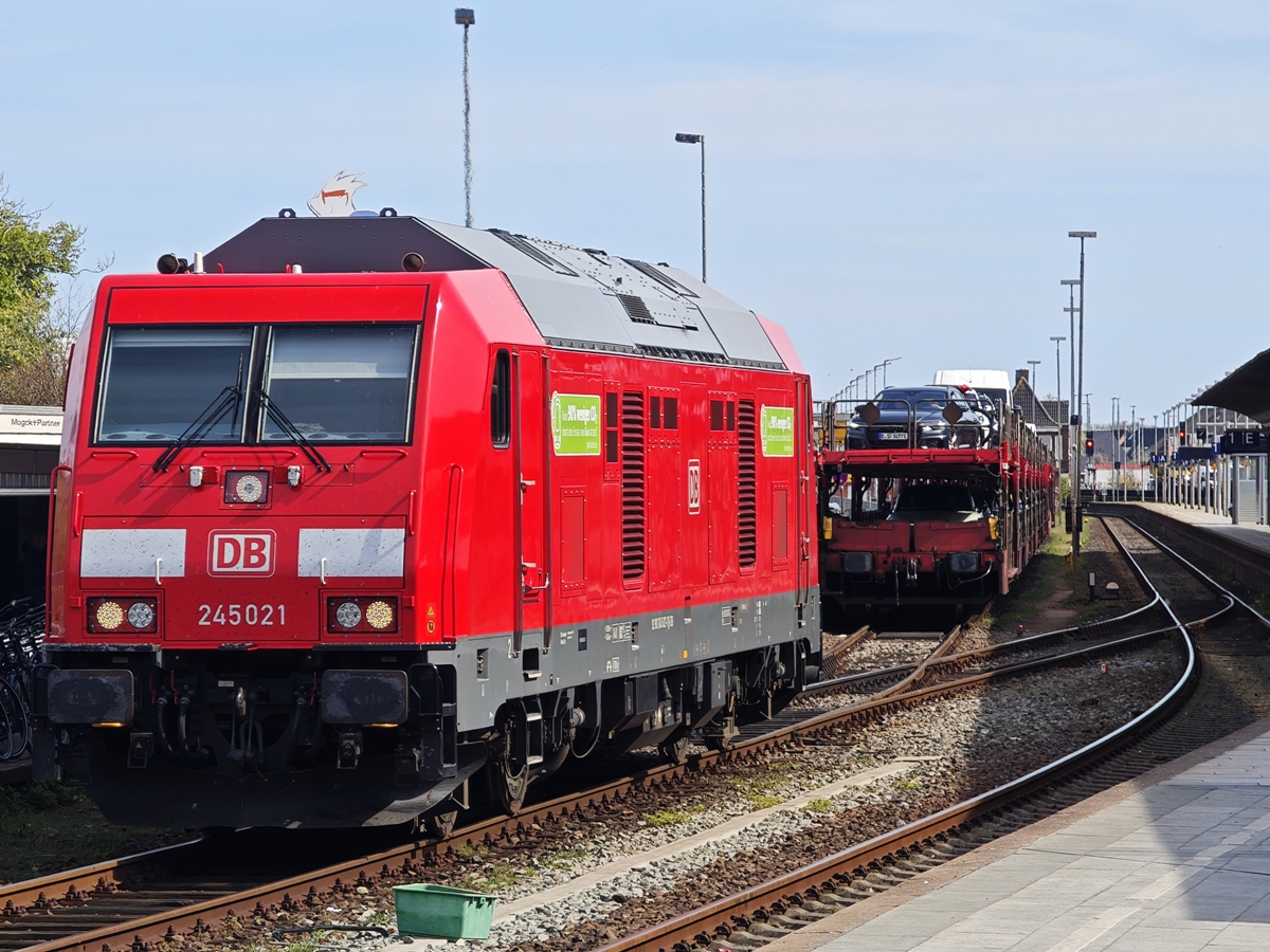 218 319-2 und 218 364-8 erreichen am Abend des 18.04.2009 mit einem Autozug "im letzten Büchsenlicht" den Bahnhof von Westerland.