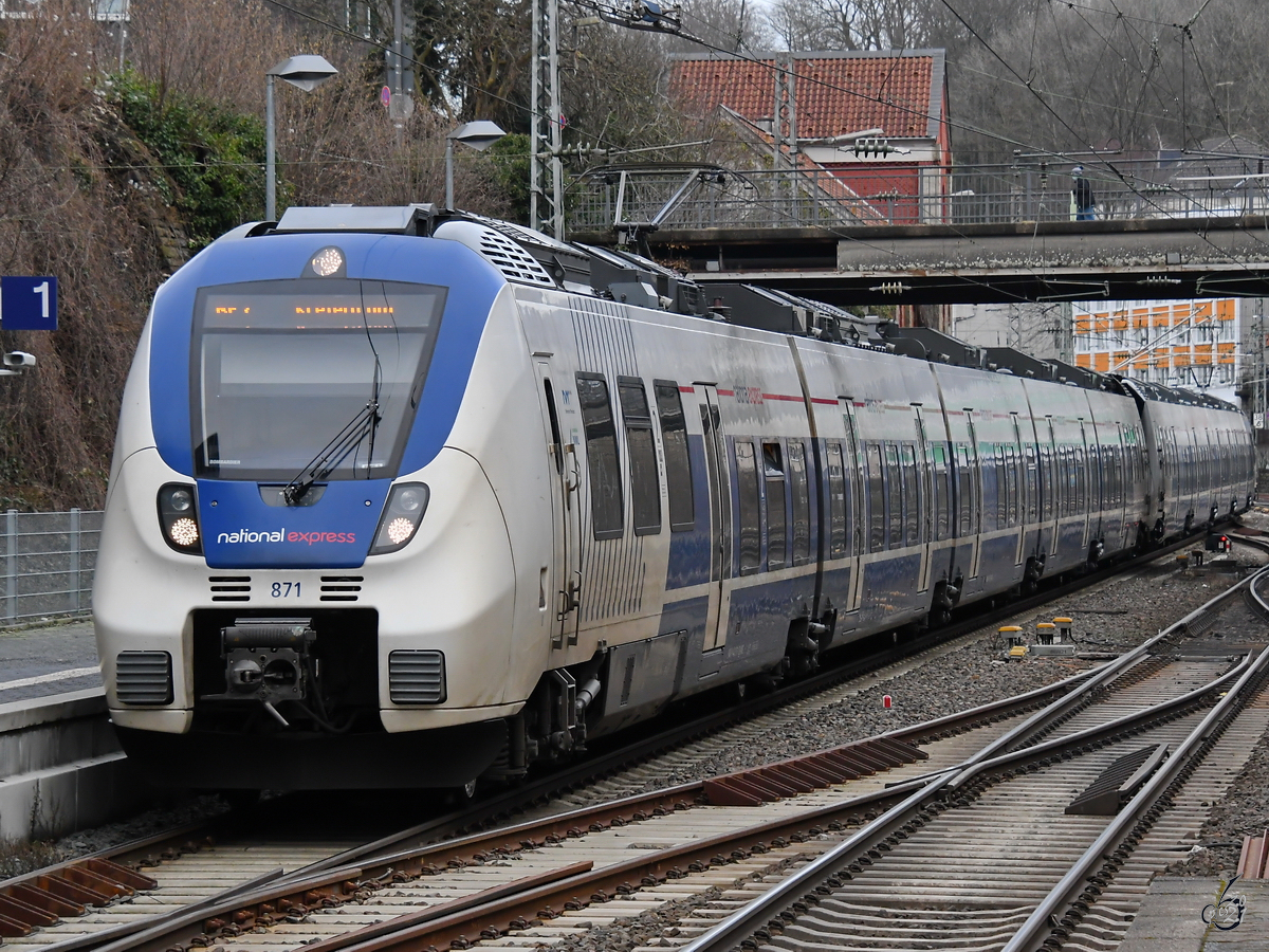 Der National Express-Elektrotriebzug 871 bei der Ankunft am Hauptbahnhof Wuppertal. (Februar 2021)