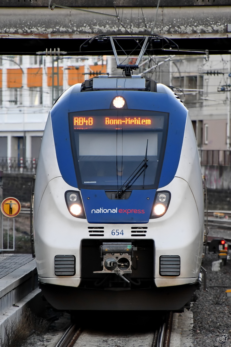 Der National Express-Elektrotriebzug 654 bei der Ankunft am Hauptbahnhof Wuppertal. (Februar 2021)