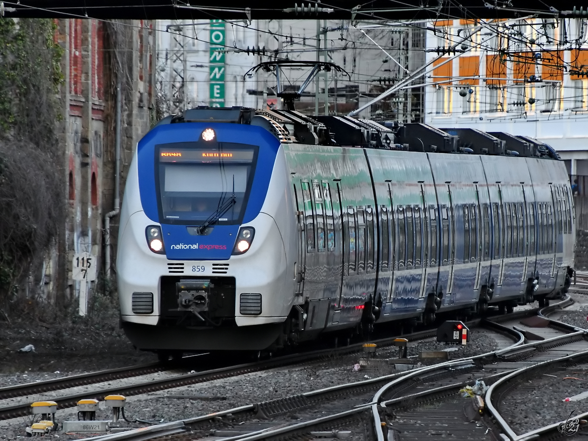 Der National Express-Elektrotriebzug 859 bei der Ankunft am Hauptbahnhof Wuppertal. (Februar 2021)