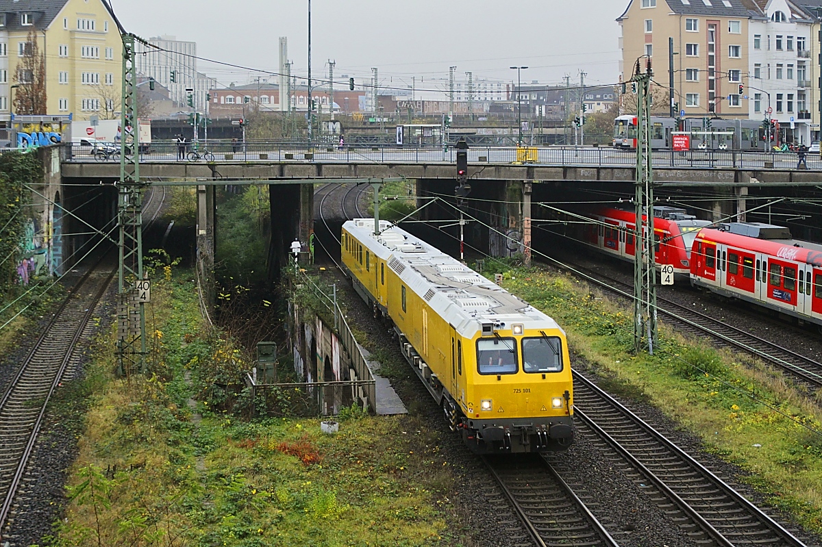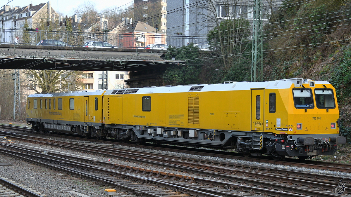 Der Gleismesstriebzug 725 101 bei der Durchfahrt am Hauptbahnhof Wuppertal. (Februar 2021)
