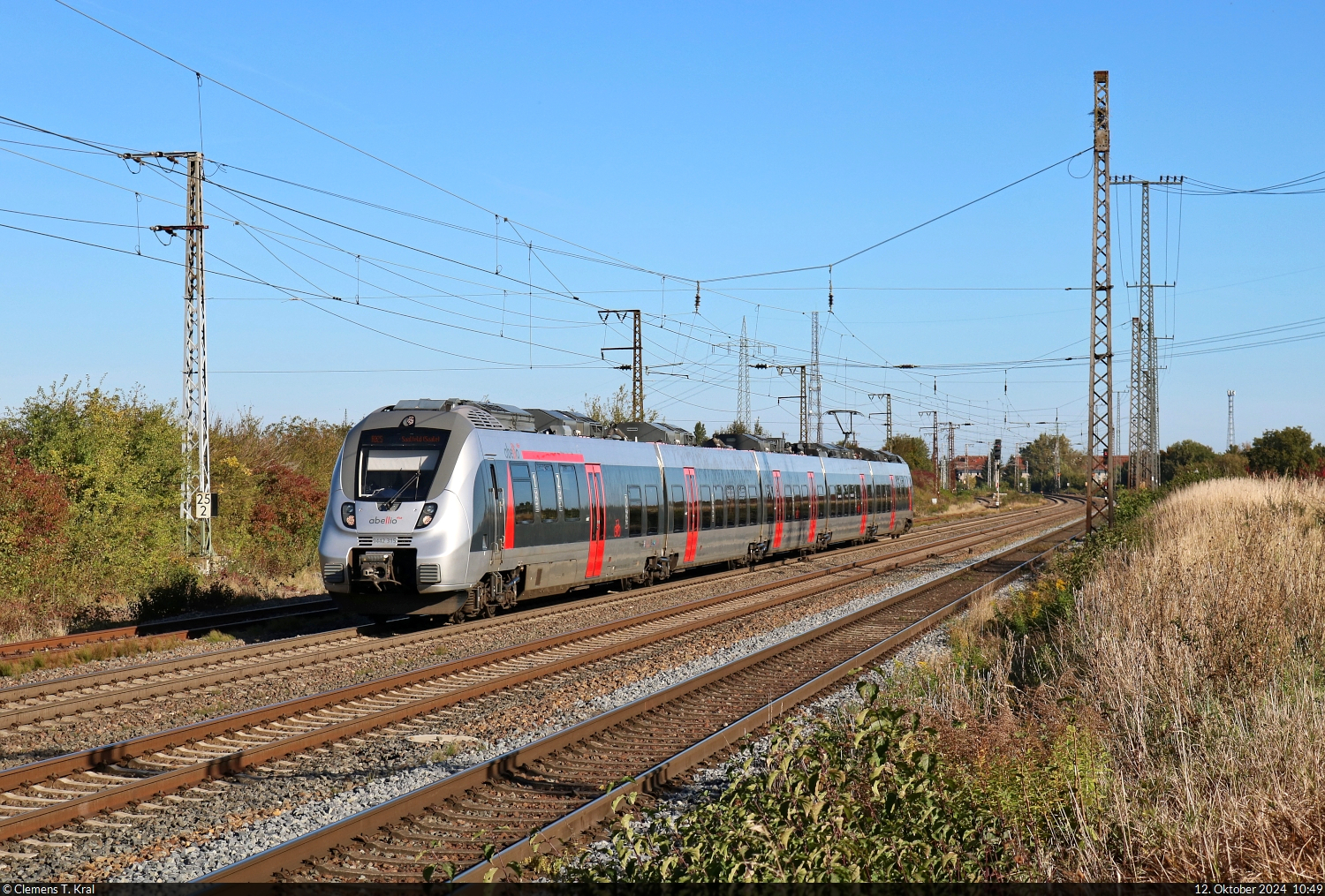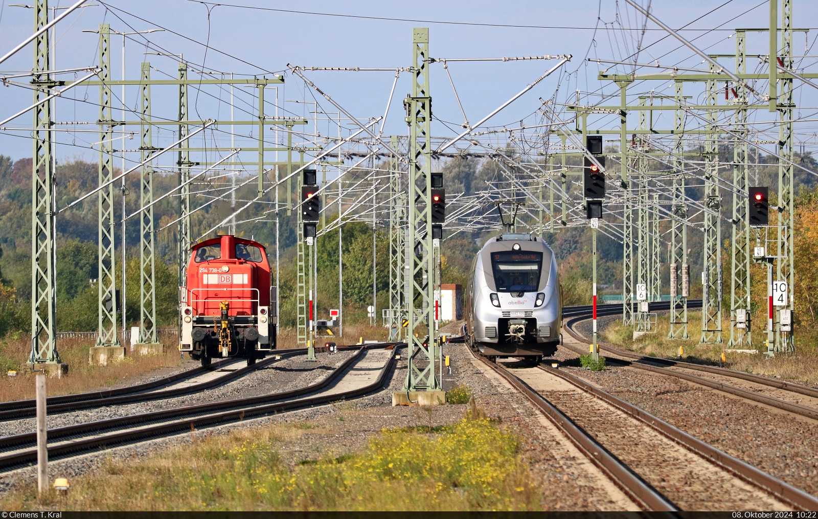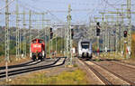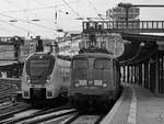 Zusammentreffen des National Express-Elektrotriebzuges 152 und der GfF-Elektrolokomotive 115 459-0, beide unterwegs als RB48, am Hauptbahnhof Wuppertal. (Februar 2021)