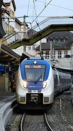 Der National Express-Elektrotriebzug 160 bei der Ankunft am Hauptbahnhof Wuppertal. (Februar 2021)