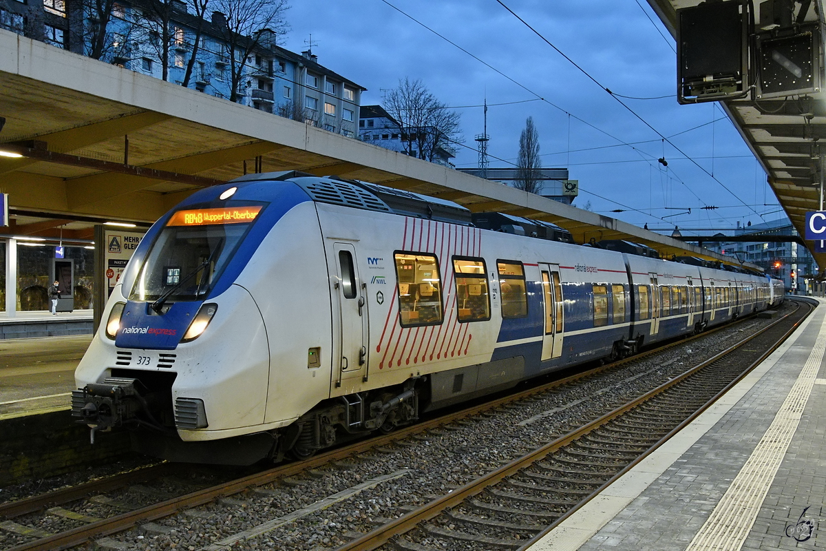 Der National Express-Elektrotriebzug 373 beim Halt am Hauptbahnhof Wuppertal. (Februar 2021)