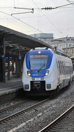 Der National Express-Elektrotriebzug 855 ist hier im Februar 2021ls RE7 nach Münster Hiltrup bei der Abfahrt vom Hauptbahnhof Wuppertal zu sehen.