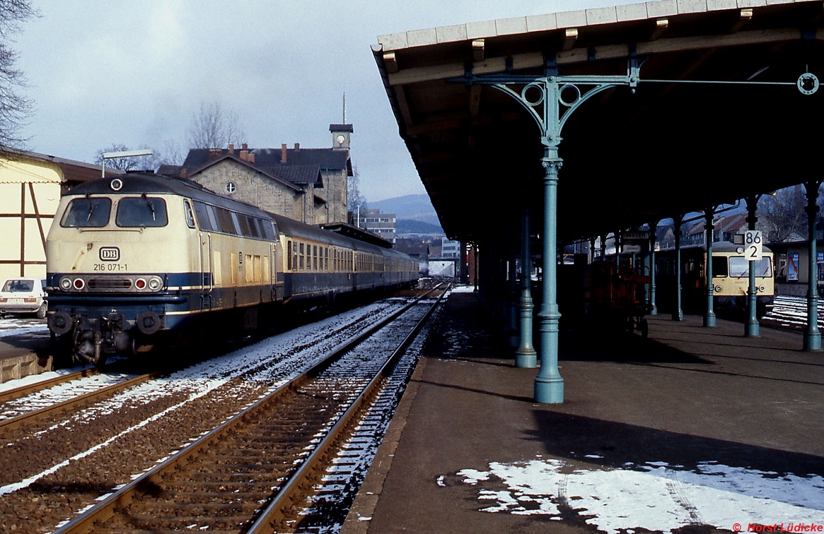 216 071-7 im Februar 1985 im Bahnhof Seesen. Im Hintergrund rechts wartet ein 515 auf die Abfahrt nach Herzberg.