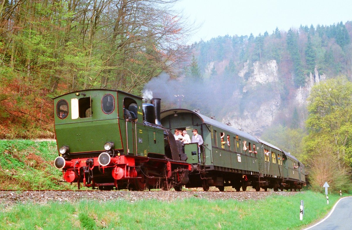 01.05.1988, Dampfbahn Fränkische Schweiz (DFS), Zug mit Lok 2 „Nürnberg“ fährt in Richtung Behringersmühle. Gestern las ich auf der Website der DFS Folgendes:  Unsere Lok “Nürnberg” steht wieder unter Dampf! Mit dieser inzwischen 96-jährigen Maschine aus dem Hause HANOMAG, die Zeit ihres regulären Einsatzes im Nürnberger Gaswerk schwere Kohlenzüge verschob, hatten wir im Juni 1983 unseren Vereinsnamen mit Leben erfüllt und die Renaissance des Dampfbetriebs im Wiesenttal eingeläutet. Neun Jahre lang stand uns die Maschine des Typs Ploxemam als einziges Dampfross zur Verfügung. 1994 erhielt sie im Dampflokwerk Meinigen einen neuen Kessel. Am 31. Mai hat sie nach einer Hauptuntersuchung in Regie des Dampflok-Teams um Ulrich Bahr die erneute Abnahme erfolgreich bestanden. Offiziell in Betrieb genommen wird die Lok, deren Stellenwert in der Geschichte unseres Vereins nicht hoch genug eingeschätzt werden kann, zum Bahnhofsfest am 14. Juli (2019).  Ich wünsche weiterhin Gute Fahrt!
