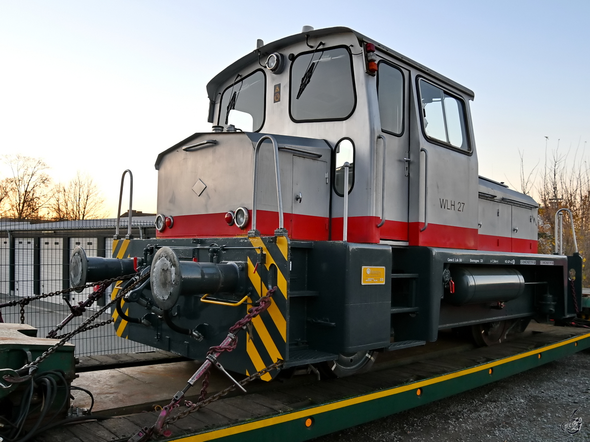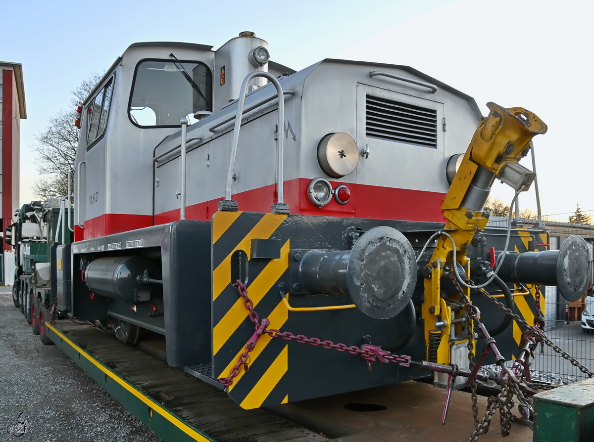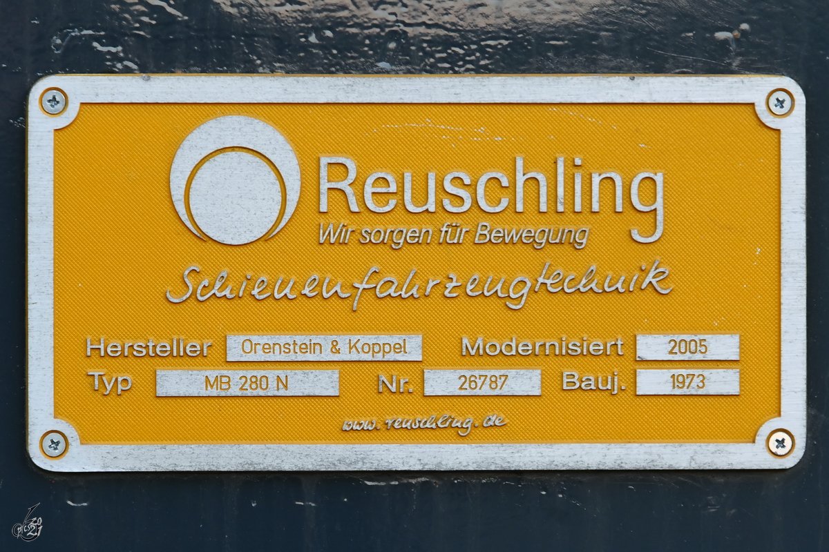 Blick durch das Werkstor der Lokomotivfabrik Reuschling, welche seit März 2024 Teil des Alstrom-Konzernes ist. Im Vordergrund zu sehen ist eine 1973 gebaute O&K MB 280 N (Fabriknummer: 26733) und in der Halle eine in der Aufbereitung befindliche Krauss-Maffei MH 05 Werkslokomotive. (Hattingen, August 2024) Christian Bremer