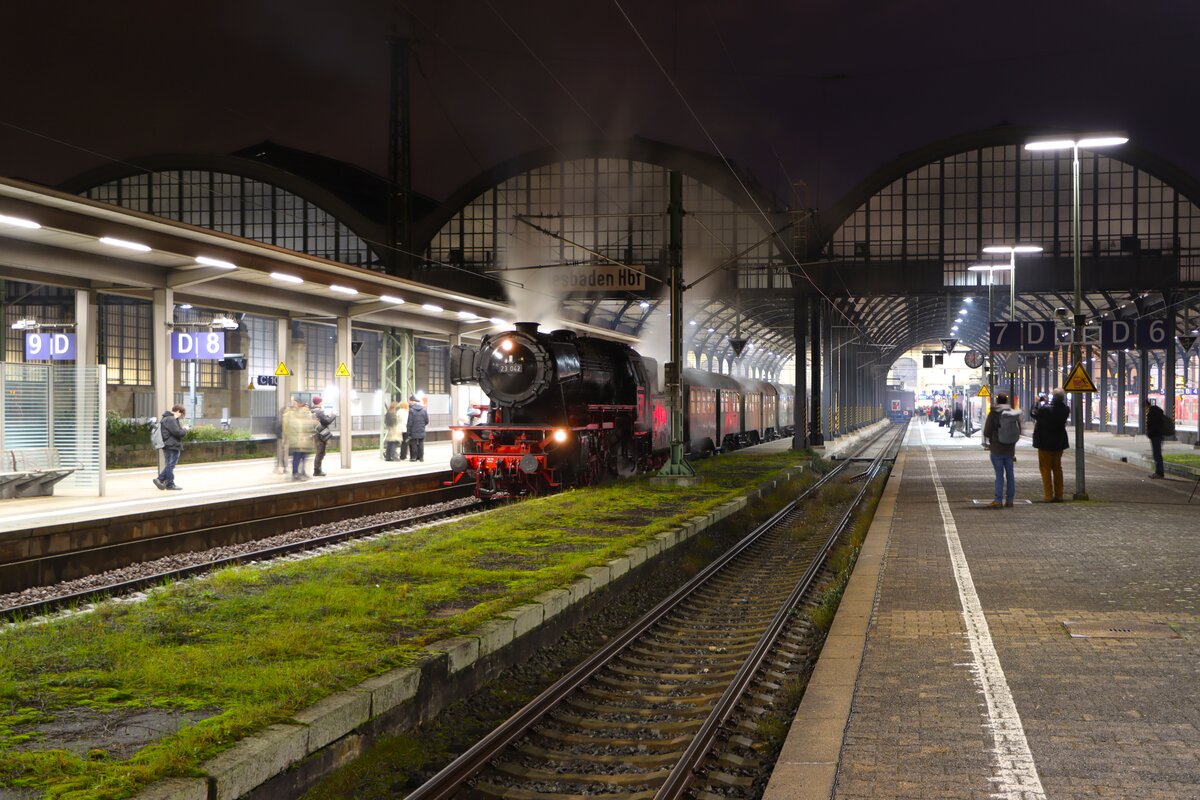 Am Samstag des ersten Adventswochenendes, 02.12.2023, fuhr der Meininger Dampflok Verein (MDV) mit seinem Sonderzug zum Würzburger Weihnachtsmarkt. Unterstützt durch die Eurovapor 23 058, die hier unter Volldampf aus dem Tunnel Rottershausen kommt, befördert sie gemeinsam mit der Güterzugdampflok 50 3501 des MDV den Sonderzug in Richtung Schweinfurt.