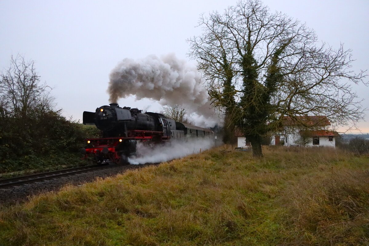 Bahnwelt Kranichstein 023 042 mit Wagenpark der Museumseisenbahn Hanau am 06.12.25 in Wiesbaden Hauptbahnof
