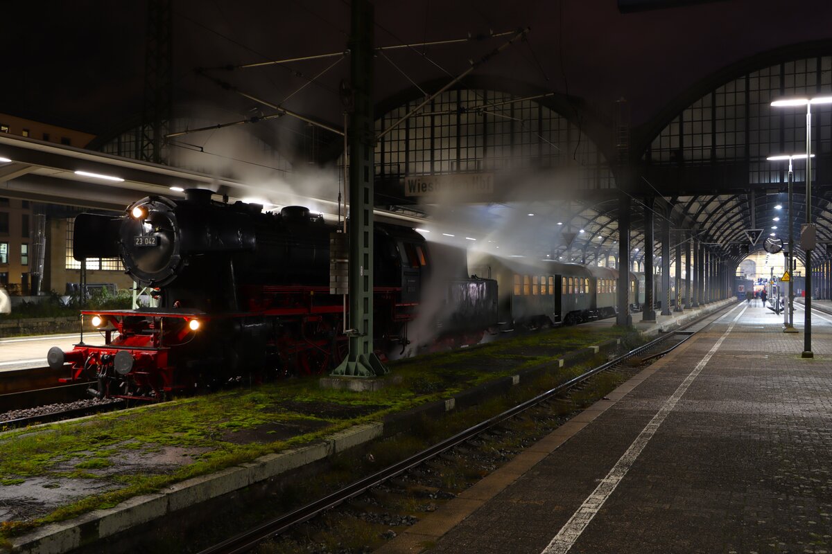 Bahnwelt Kranichstein 023 042 mit Wagenpark der Museumseisenbahn Hanau am 06.12.25 in Wiesbaden Hauptbahnof