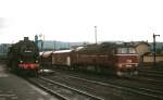 44 0280-6 (Borsig 15266/1942) und 44 0393-7 (Schichau 3585/1943) im Oktober 1980 am Wasserkran im Bahnhof Saalfeld. Die 44 0380-6 war bis zum 31.01.1982 in Saafeld beheimatet und wurde dann nach Rostock abgegeben, am 26.09.1986 wurde sie ausgemustert. 44 0393-7 befand sich bis 26.12.1982 in Saafeld und kam noch bis zum 17.05.1989 als Heizlok nach Elsterwerda.