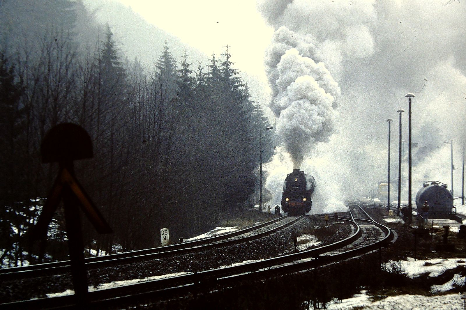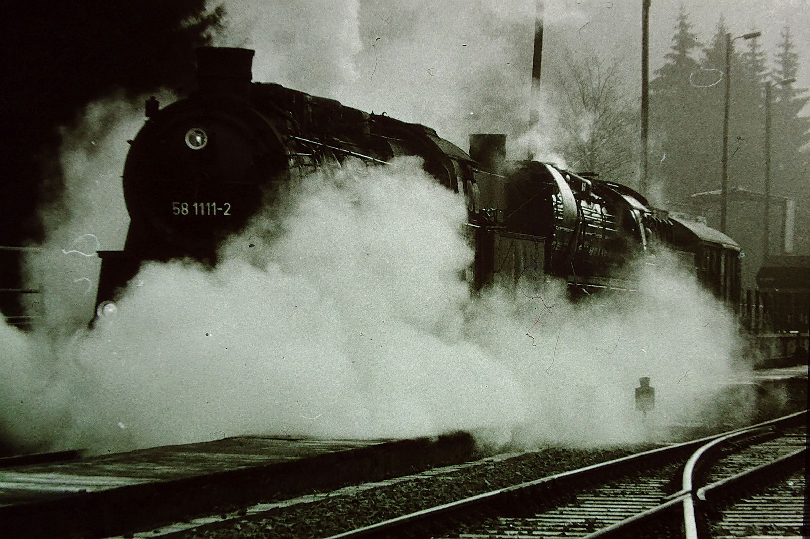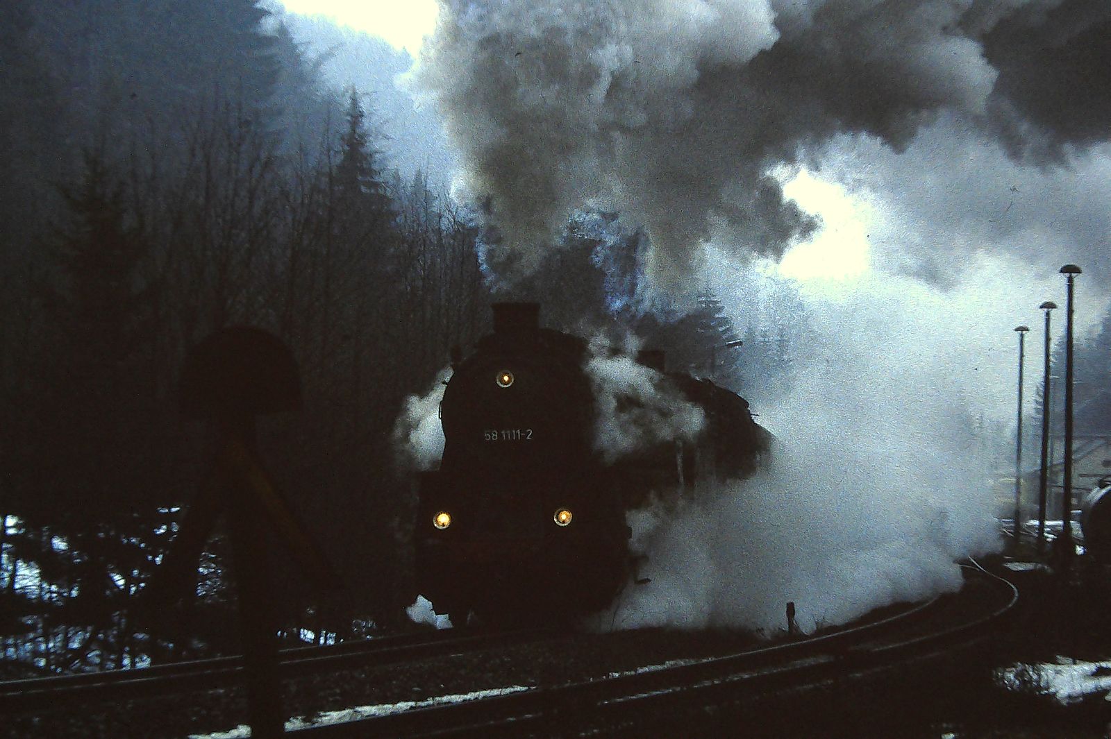 058 (Plandampf im Thüringer Wald Rennsteig & Lobenstein 18.- 21. März 1993 ) Abfahrt Dg 55613 Arnstadt-Meiningen Vorspann 58 1111-2 und Zuglok 44 1093-2 im Bahnhof Gehlberg aufnahme S-W mit Agfa Iso Kamera Minolta X-300 Jan Stein