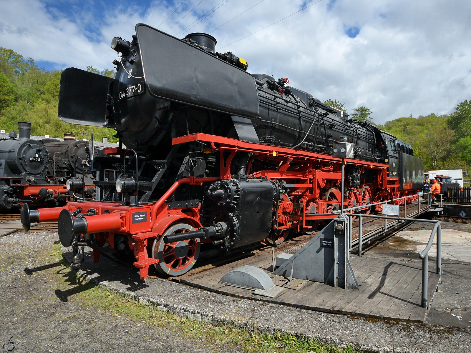 Passt gerade mal so auf die Drehscheibe des Eisenbahnmuseums in Bochum, die 1943 bei Krupp gebaute Güterzugdampflokomotiven 044 377-0. (April 2026)