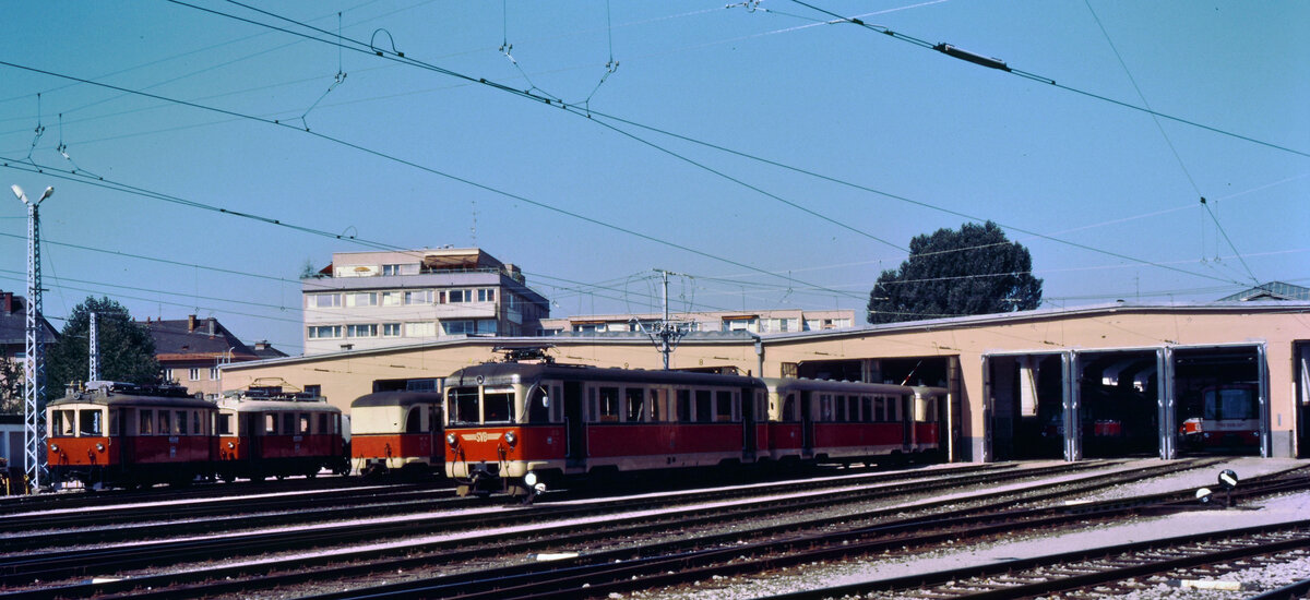 Zwei ET-Baureihen der Salzburger Lokalbahnen (neu und alt) vor der Wagenremise: ET 42 von 1983 und ET 33 von 1951 ("Grazer Triebwagen" von SGP)