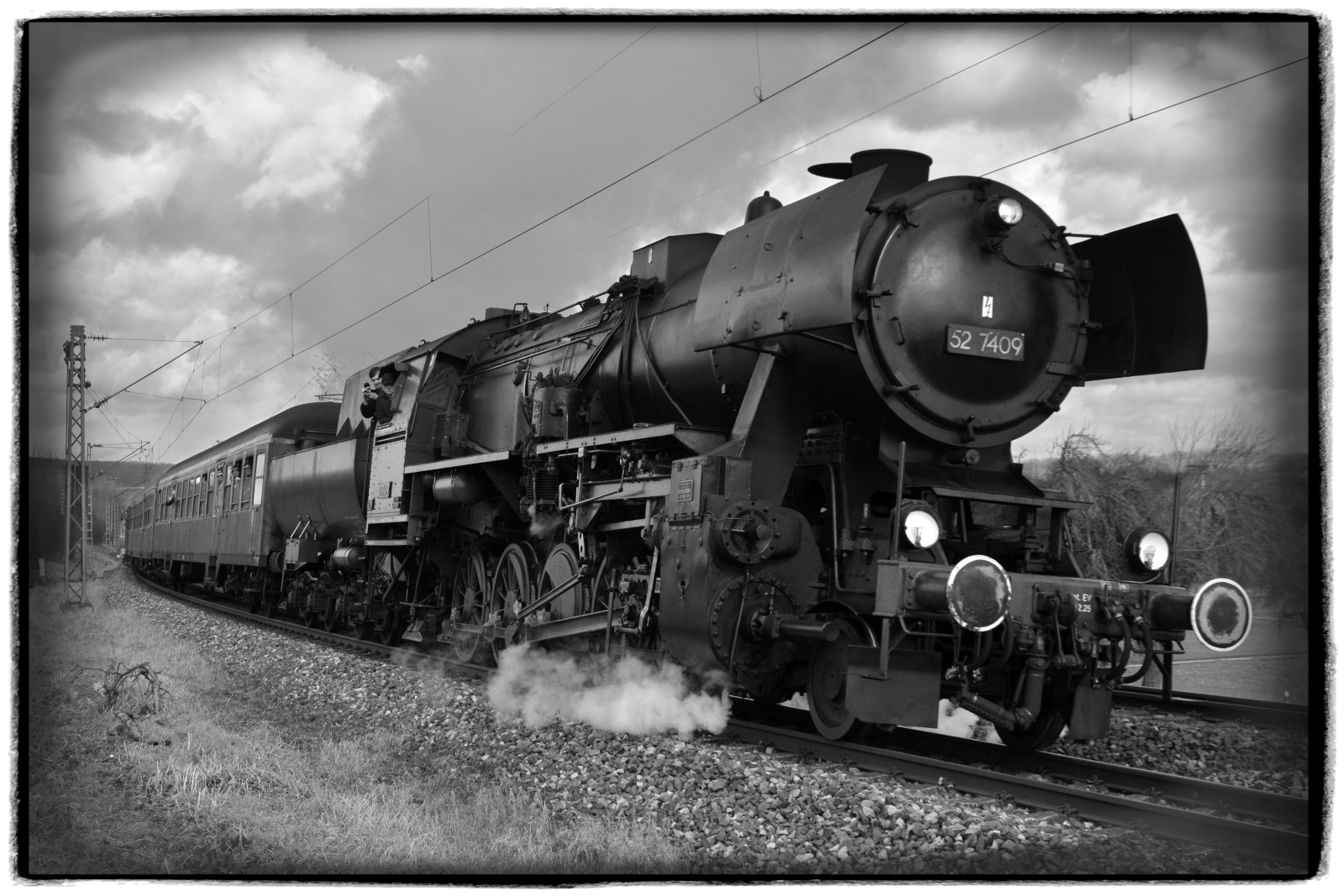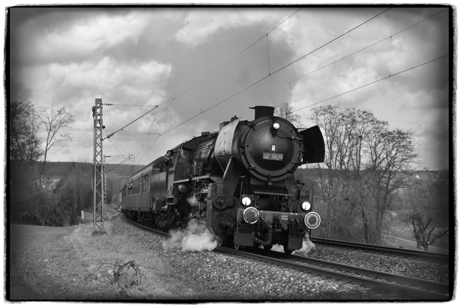 Die ehemalige Kriegslok 52 7409 (WLF - Wiener Lokomotivfabrik Floridsdorf, Baujahr: 1943, Fabriknummer: 16862) stampfte am 01.03.2026 mit Volldampf und dem Sonderzug DZ 93512 Darmstadt-Kranichstein - Wertheim die Steigung bei Reichenberg/Unterfranken herauf. Interessant zu beobachten ist auch, wie sich das Zickzack-Muster der Oberleitung auf den Schwellen abzeichnet. Matthias Kümmel