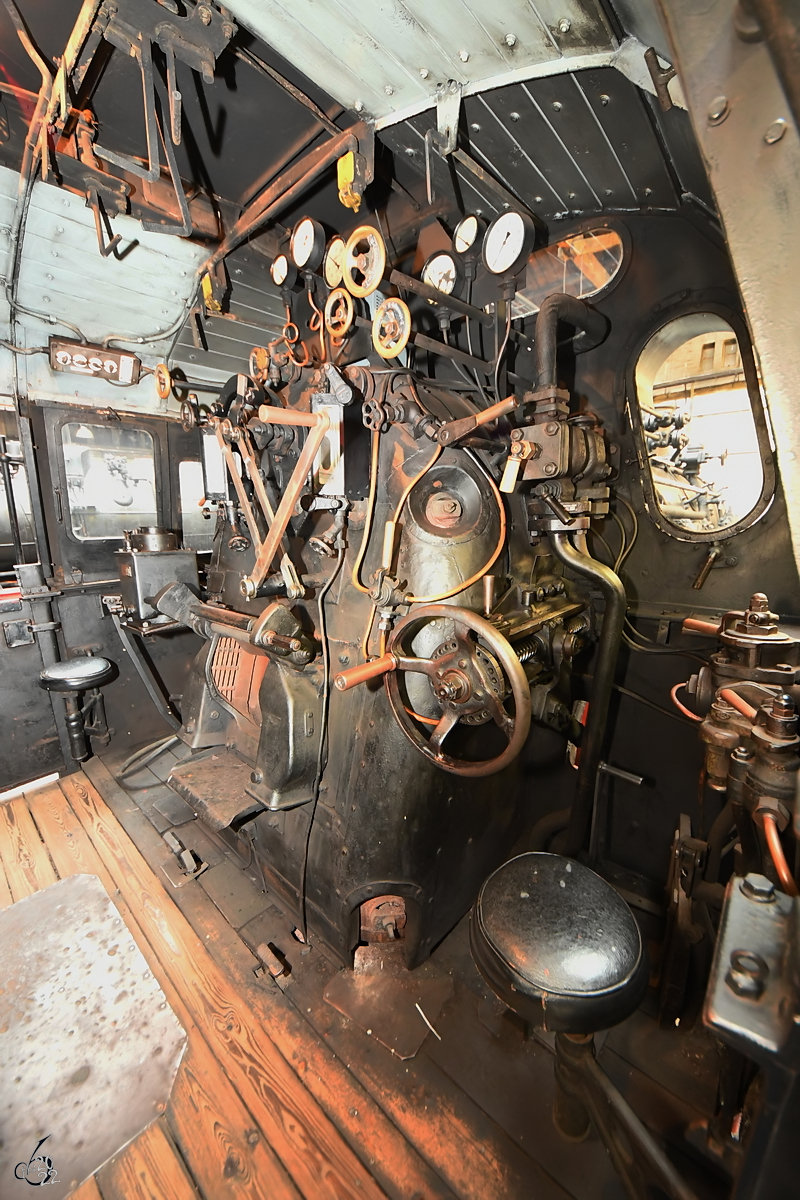 Blick in den Führerstand der 1938 bei Henschel gebauten Güterzugtenderlokomotive 89 008. (Mecklenburgisches Eisenbahn- und Technikmuseum Schwerin, März 2022)