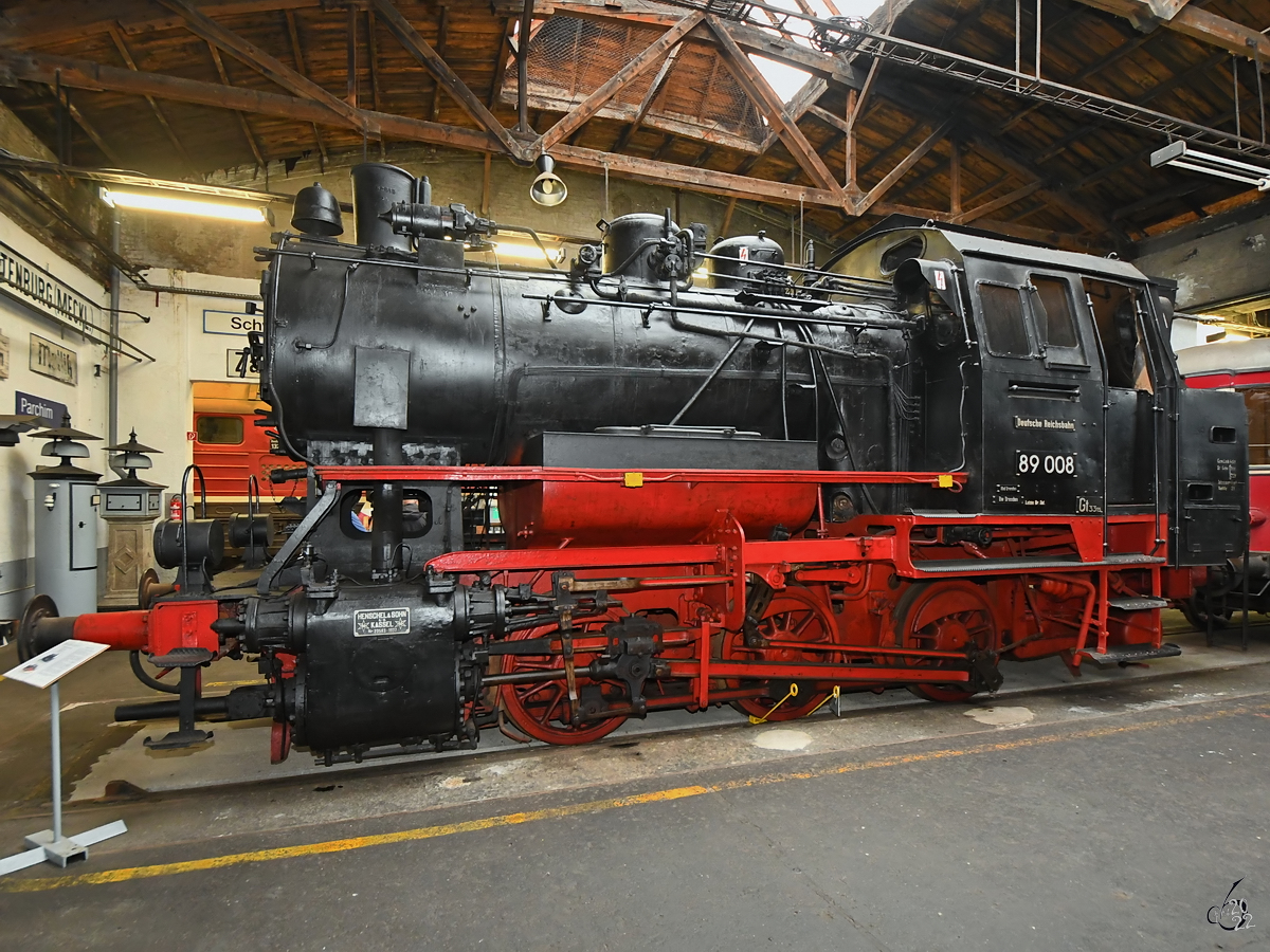 Die Güterzugtenderlokomotive 89 008 wurde 1938 bei Henschel gebaut und ist Teil der Ausstellung im Mecklenburgischen Eisenbahn- und Technikmuseum Schwerin. (März 2022)