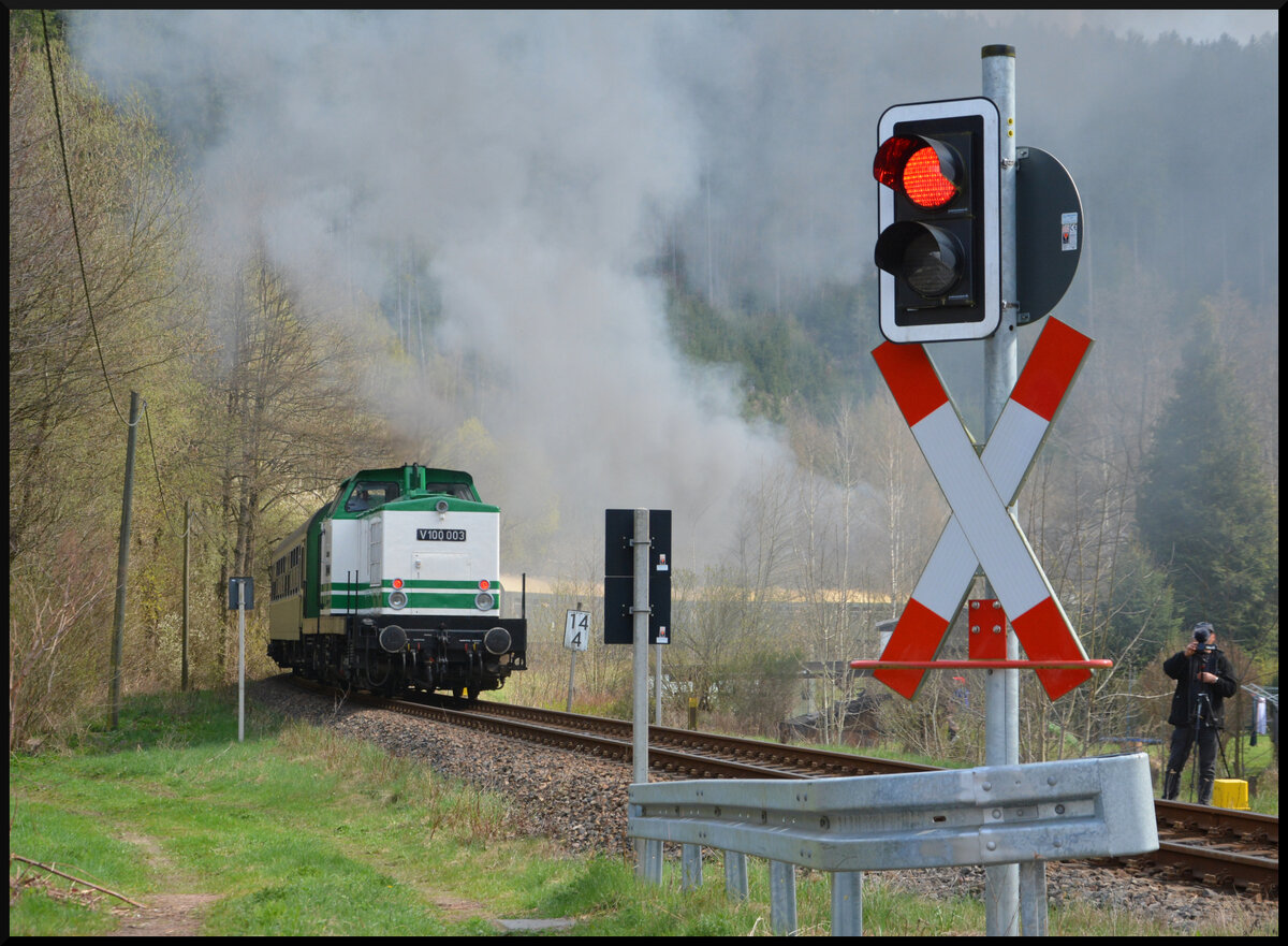 Die Diesellok V100 003 (NVR: 92 80 1201 003-1 D-DB, DB Museum Nürnberg) schob am 18.04.2026 den von UEF 58 1111 (NVR: 90 80 0058 311-6 D-UEF) geführten GleisGlück-Sonderzug DZ 88724 Chemnitz - Schlettau - Chemnitz hier in Dittersdorf das Zwönitztal hinauf nach.