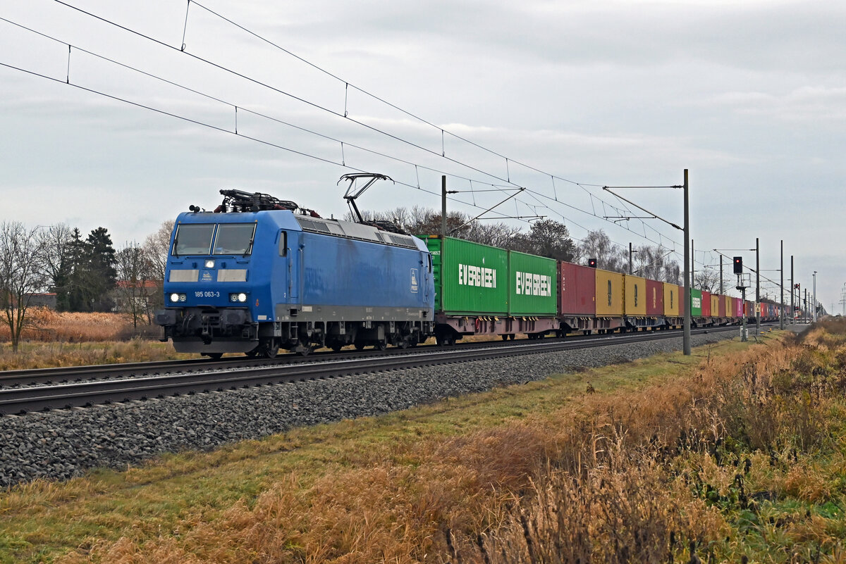 185 063 (482 033) der Press führte am 10.12.25 einen Containerzug durch Braschwitz Richtung Halle(S).