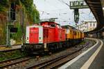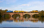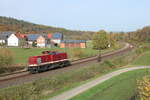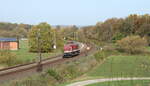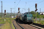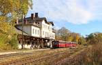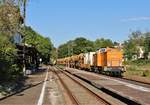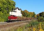 203 843 (RIS) mit einem Holzzug aus Tirptis, ist hier bei der Einfahrt in Pößneck oberer Bahnhof am 06.10.22 zu sehen.