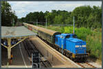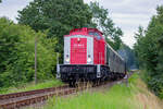 PRESS 204 005-3 (92 80 1203 350-4 D-PRESS) als Schlusslok am DPE 1822 "Pfefferminzexpress" von Sonneberg (Thür) Hbf nach Sömmerda unt Bf, am 17.08.2024 bei Frohndorf. Die Eisenbahnfreunde Sonneberg waren zum Bahnhofsfest "150 Jahre Pfefferminzbahn" in Sömmerda unterwegs.
