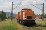 Reichsbahn-Fuhre: 203 120-1 (202 678-9 | 112 678-8 | 110 678-0 | DR V 100.1) überführt einen Doppelstockwagen mit der Bezeichnung  DBuza<sup>747.4</sup>  (50 80 25-33 018-6 D-WFL) sowie 155 222-3 (250 222-7) durch Brehna Richtung Halle (Saale).