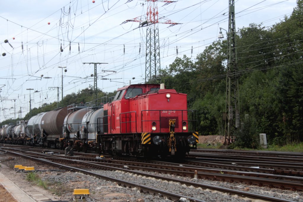 203 111-0 DB kommt mit einem Kesselzug aus Köln-Kalk und fährt in Köln-Gremberg ein bei Sommerwetter.
